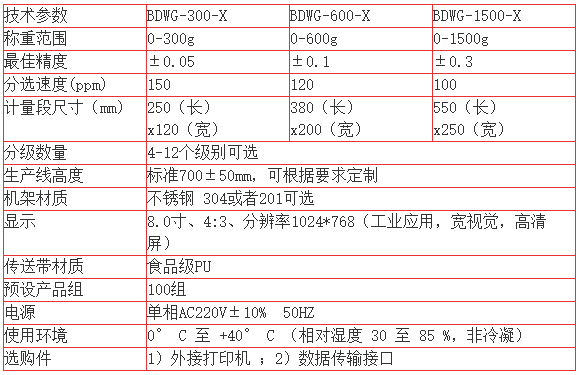 現(xiàn)在市面上所生產(chǎn)的分選秤的工作原理如下:就是將稱重物料準備產(chǎn)品進入分選秤這個時候我們一般根據(jù)產(chǎn)品的間距和所要求的速度來共同決定。目的是保證在分選秤工作過程中,只能有一件產(chǎn)品在秤臺上。稱重過程當產(chǎn)品進入稱重輸送機后,系統(tǒng)根據(jù)外部信號,如光電開關(guān)信號,或內(nèi)部電平信號,識別待檢測產(chǎn)品進入稱重區(qū)。根據(jù)稱重輸送機運行速度和輸送機的長度,或者根據(jù)電平信號,系統(tǒng)可以判定,產(chǎn)品離開分選秤的時間。從產(chǎn)品進入秤臺到離開秤臺,稱重傳感器將檢測到下圖所示信號,控制器選取信號穩(wěn)定農(nóng)區(qū)域的的信號進行處理,就可的得到產(chǎn)品的重量。分選過程當控制器得到產(chǎn)品的重量信號后,系統(tǒng)將和預(yù)先設(shè)定的重量范圍進行比較,對產(chǎn)品進行分選。